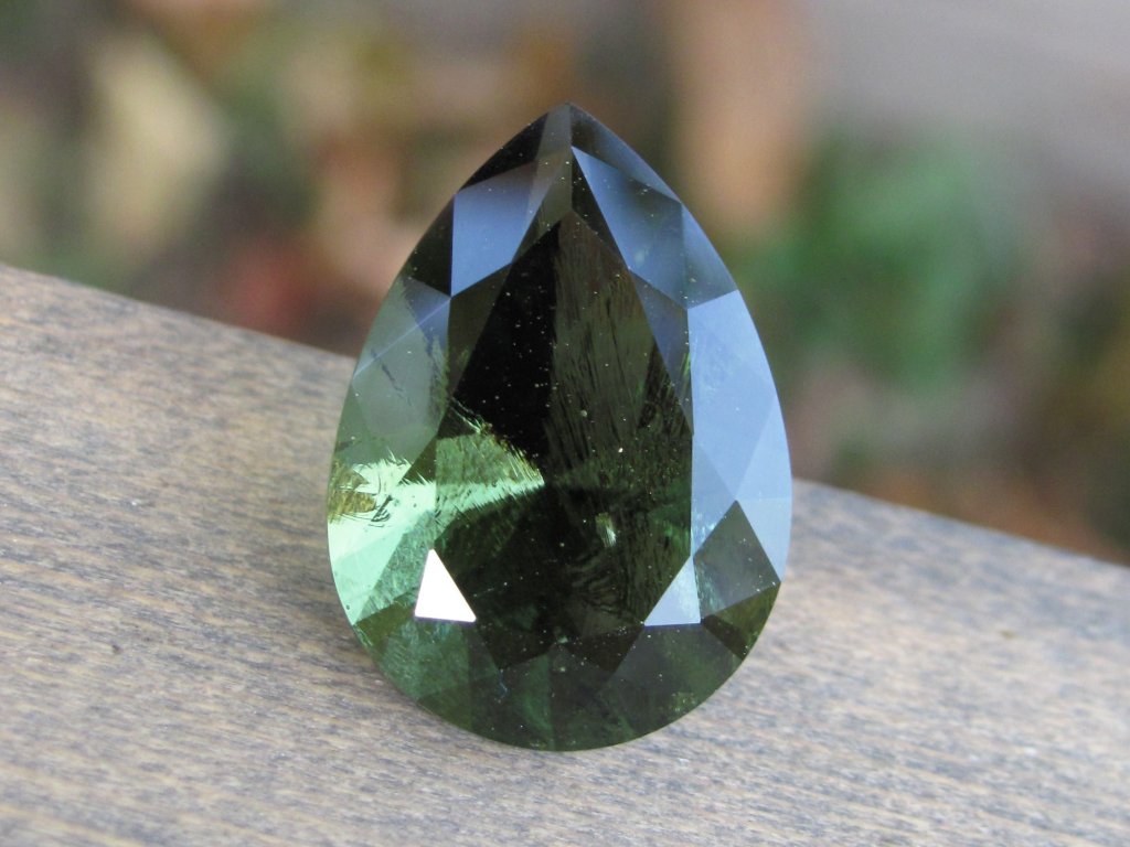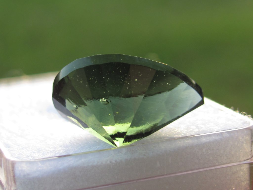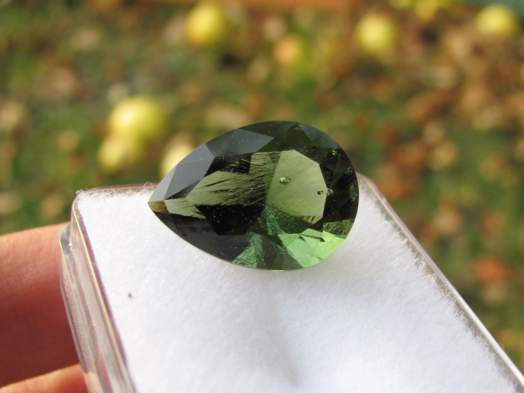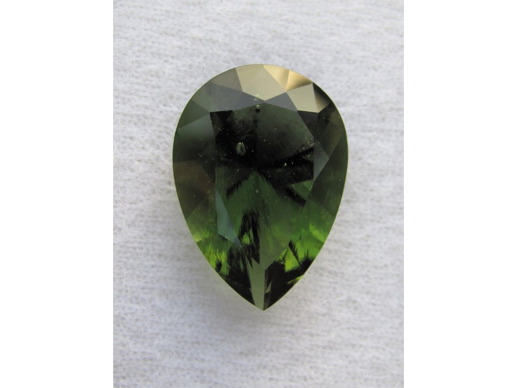 Vltavín-moldavit, krásná zelená barva, briliantový brus ve tvaru kapky 15,84ct